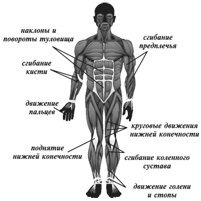 Скелетные мышцы предназначены для создания тяговых усилий, они участвуют в движениях туловища и конечностей, в значительной мере определяющих движения человека. Функциональное назначение основных скелетных мышц показано на рис.P31. Это: мышцы, предназначенные для сохранения вертикального положения тела; мышцы, сгибающие и поворачивающие туловище; мышцы, поднимающие, сгибающие и разгибающие конечности и другие. Форма мышцы зависит от места ее расположения и выполняемой функции.
